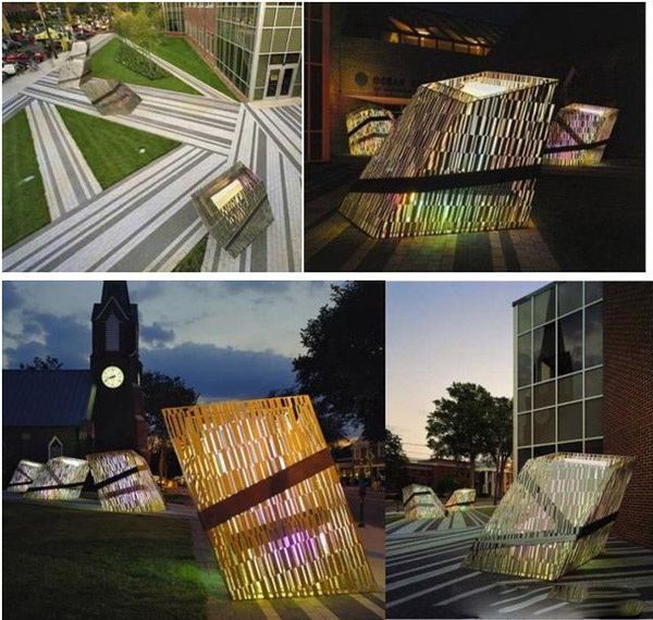 美國(guó)Mikyoung Kim完成了新澤西州海洋縣公共圖書(shū)館門(mén)前的一系列景觀(guān)照明設(shè)計(jì)。這個(gè)由激光切割不銹鋼和玻璃構(gòu)成的景觀(guān)燈具,應(yīng)用了條碼圖案來(lái)表達(dá)在數(shù)字時(shí)代下信息的傳播。五個(gè)一組的燈具被用激光切割成的鋼鐵包裹在一起,它們既能反射光線(xiàn),又能從內(nèi)部發(fā)出光芒,從白天到黑夜都有變化。